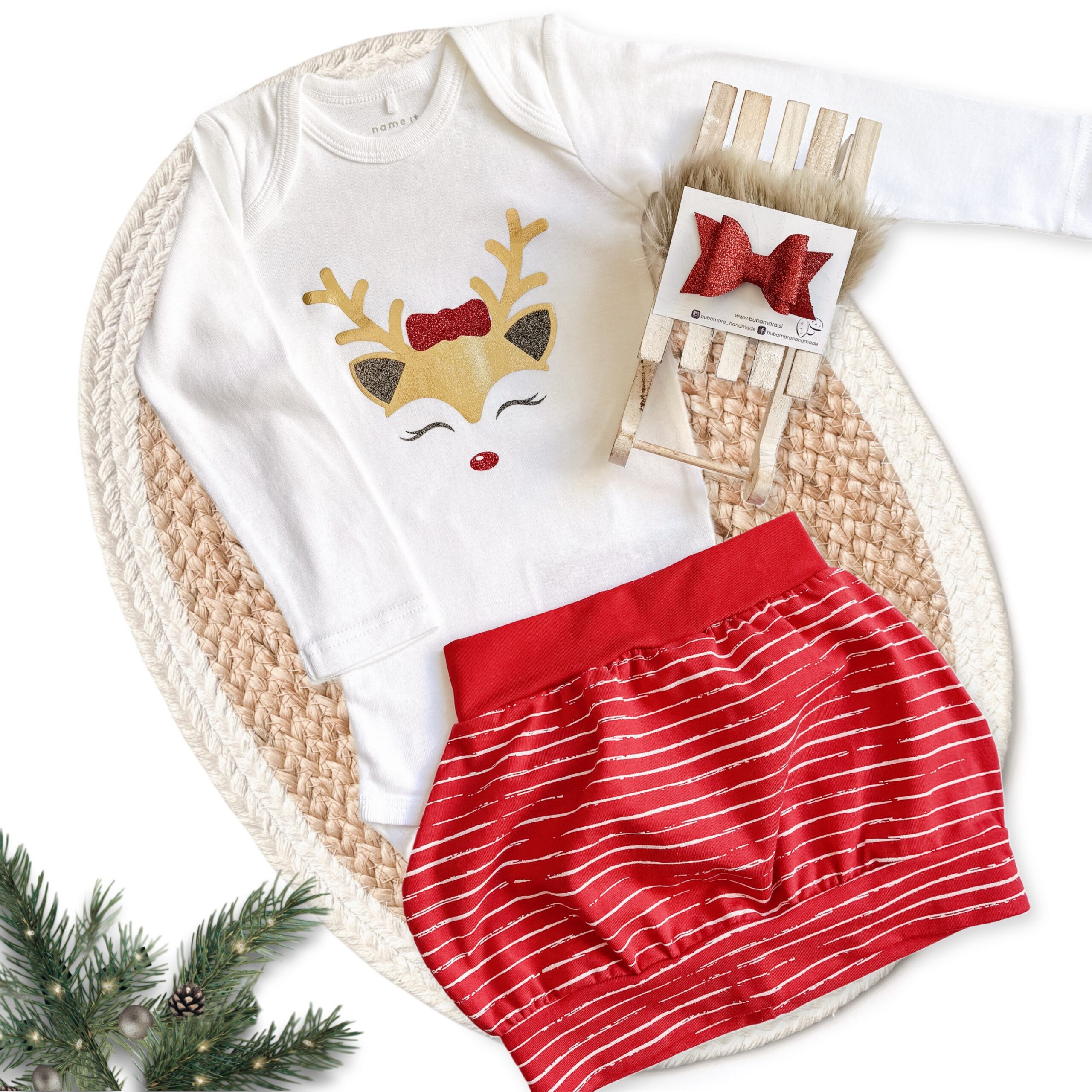 Za najlepši čas v letu, s tem kompletkom svojo deklico oblečete v duhu božiča: v rdeče belo kombinacijo z matchy pentljico. Set je sestavljen iz bodija, balon krilca in ujemajočo špangico s pentljico.